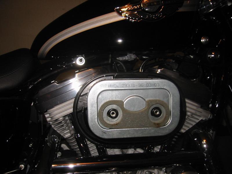 After removing the air cleaner cover, you can see the stock filter element and backing plate.