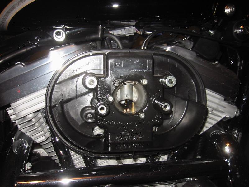 With the filter element removed, here's the stock air cleaner's backing plate. You can see the 2 head breather bolts and the throat of the carburetor in this shot.