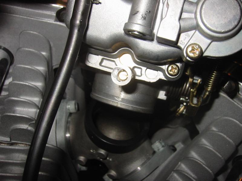 A photo of the low-speed fuel adjustment screw with the tamper resistent plug removed.