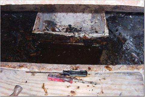 Closer view of the rot in the bilge. This is thick fiberglass, but it was framed by plywood. It look like this was modified at some point, but its hard to tell. There is a hole from this well into the bilge. For some reason it is about an inch above the area it is supposed to drain. It was designed as though it would never get wet.