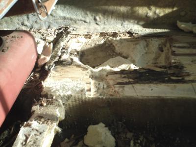 Floor is only rotted out where Previous owner stapled down vinyl floor, this penatrated to 1x10s... there are no stringers in this boat. If you look close you can see where I cut the top section of fiberglass where it joins the first 1x10 and the "V" well in the Keel.