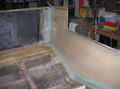 New transom core glassed in. Used 6 oz. cloth between 1st ply and transom skin. Bonded ply to ply with thickened epoxy. Went over face of inside ply with 9 oz. cloth, 12 oz. biaxial & one more 9 oz. cloth. Tabbed it all in over fillets with three staggered layers of 15 oz. biaxial tape.
