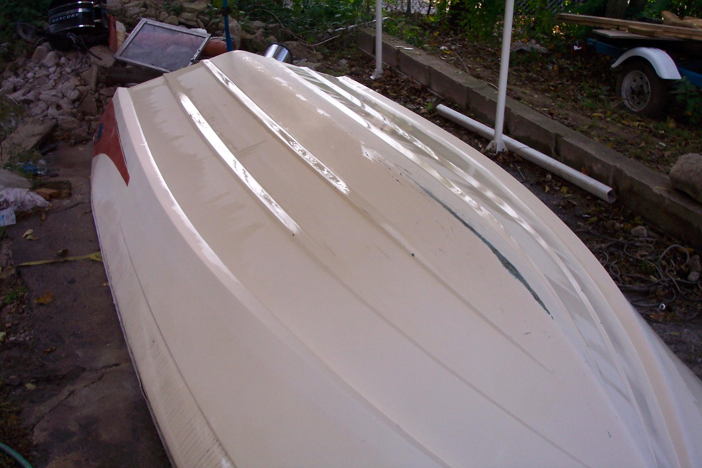 (10-10-2006) After what seemed like eternity, I am done sanding the bottom paint off. I then scrubbed it down with Comet and an abrasive sponge. I am was hoping that the weather would stay int eh upper 60s for a couple more days but it turned cold and rainy.