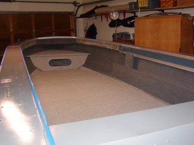 The gun walls are in and covered with marine carpet. Rod storage will be added later. The bow piece was rebuilt in the original configuration and covered with Natulex.