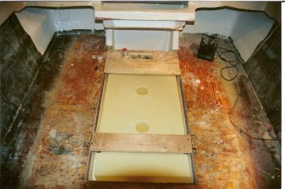 Here the tank is going in. The 2 cross pieces have wooden blocks on the underside matching the mounting pads on the tank to hold it in place.