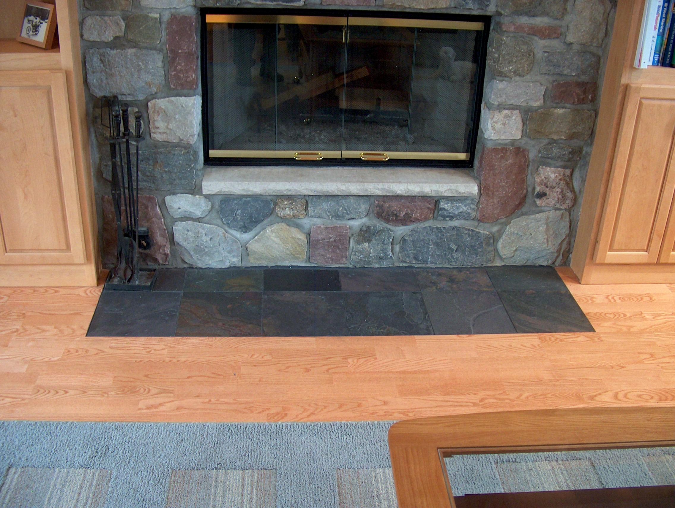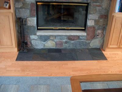We originally planned to use a beige tile for the hearth, but after laying them out, we decided to go with a darker color. Ended up with this medium-dark slate. It will hide dirt and ash from the fireplace and cleans up easy with soap and water. Slate is set using thin-set mortar. Used latex grout in a tube and applied with caulk gun. Worked out great.