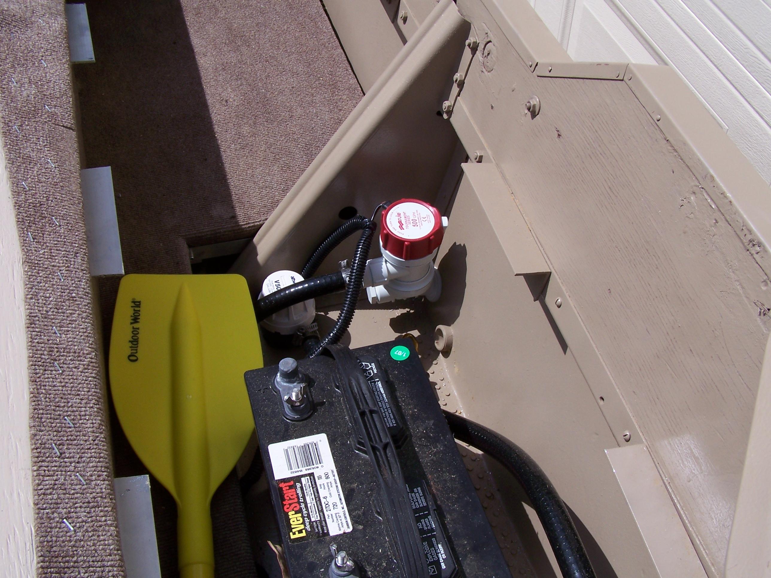 Livewell and bilge pump installed. Plumbing ran under floor bracing. All wiring for pumps, lights etc ran in 2" pipe under floor.