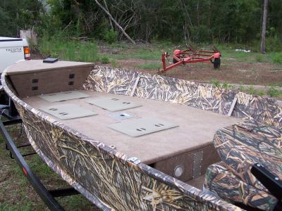 The front deck has a livewell, battery compartment, cooler and dry storage. There is a seat base for one of the seats and a pedestal. There are 3 12v plugs on the front and a TM plug.