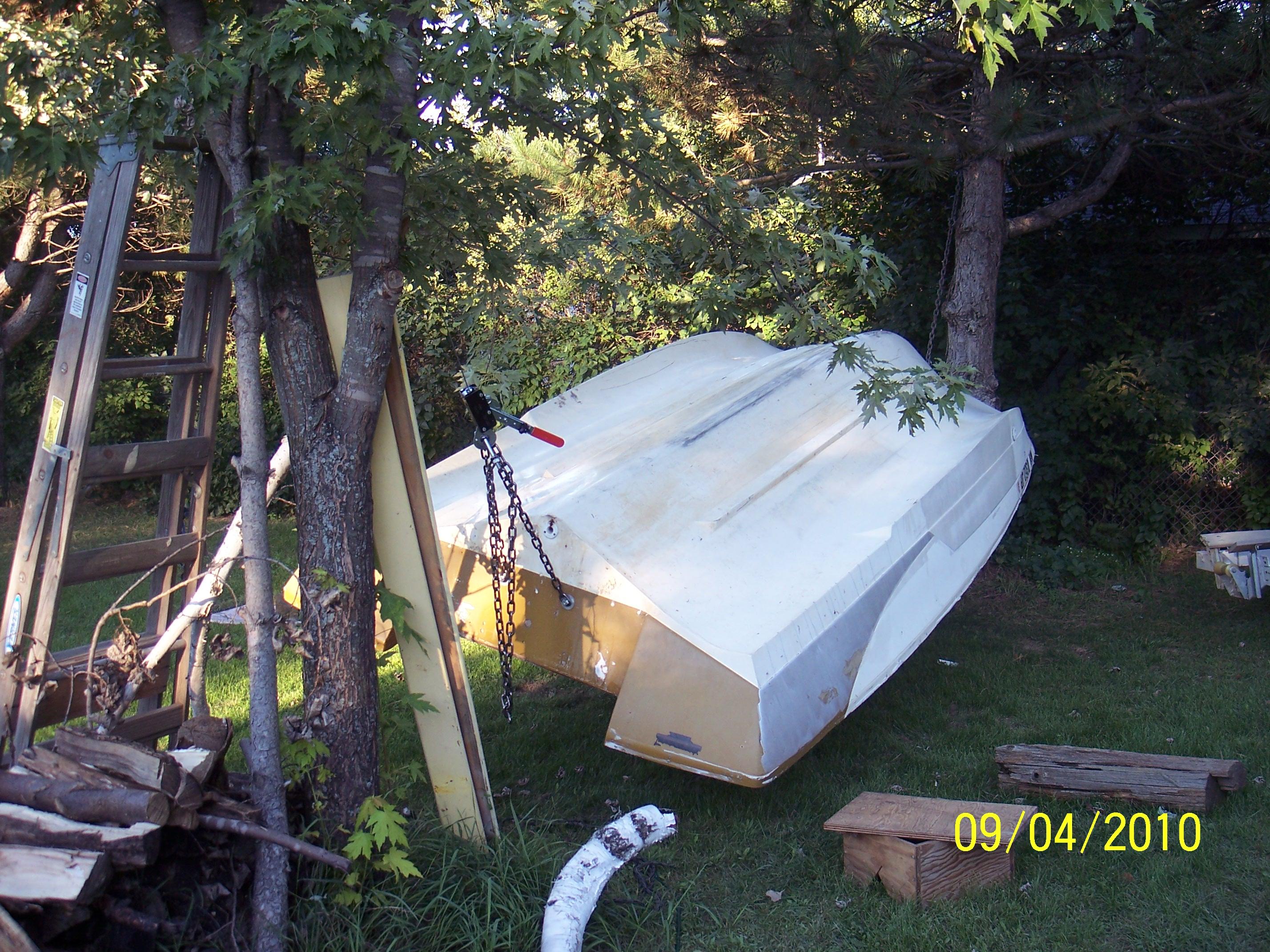 Now that the deck is in, I can start working on the cosmetics of the boat. This required flipping the hull. Fortunately for me, I had two trees sturdy enough to use for this task. I hooked a chain to the tree and then lifted the nose of the boat as high as I could and hooked the chain on. I did this by using the winch to lift the front of the trailer up as high in the tree as I could, hooked the chain to the bow eye and then reversed the winch to let the trailer down.