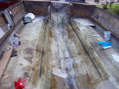 grinding out the hull proved dubious. I ground areas thin, cut through a couple of places and generally was overzealous. Fortunately, nothing was major. I layed a strip of 1708 biax down the strakes where I did the most damage, and then used the same plus some left over mat in areas that wouldn't get additional glass from the rebuild.