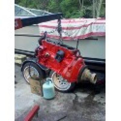 I left the oil pan and head off for clearance. Transferred the bell housing and oil pump.....and she is goin in!!!! I will attach a few more parts before I actually drop the engine into the bilge.