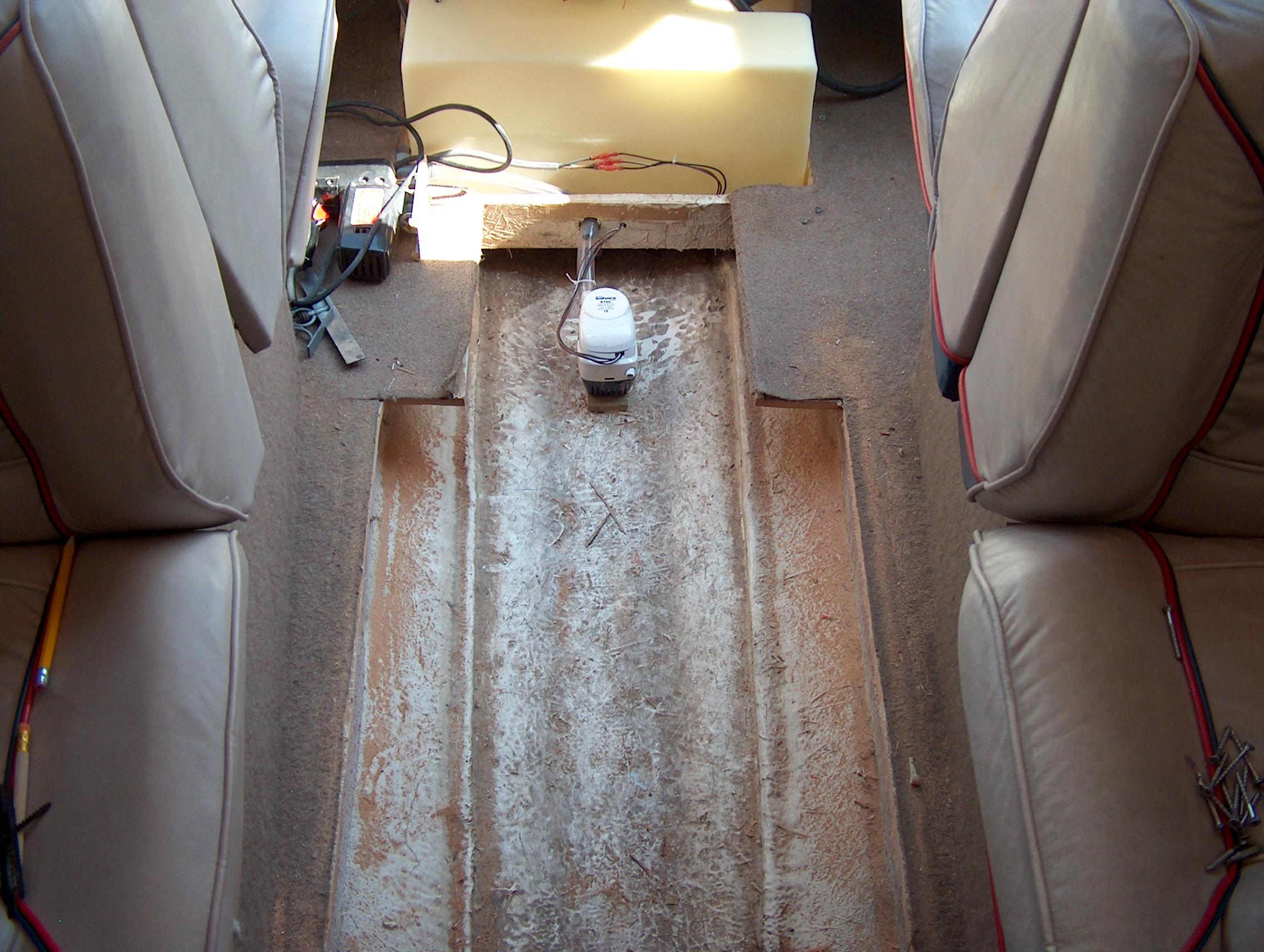 The deck is cut back to the stringers, widening the area to 23 inches. The bilge pump will be covered with new plywood.