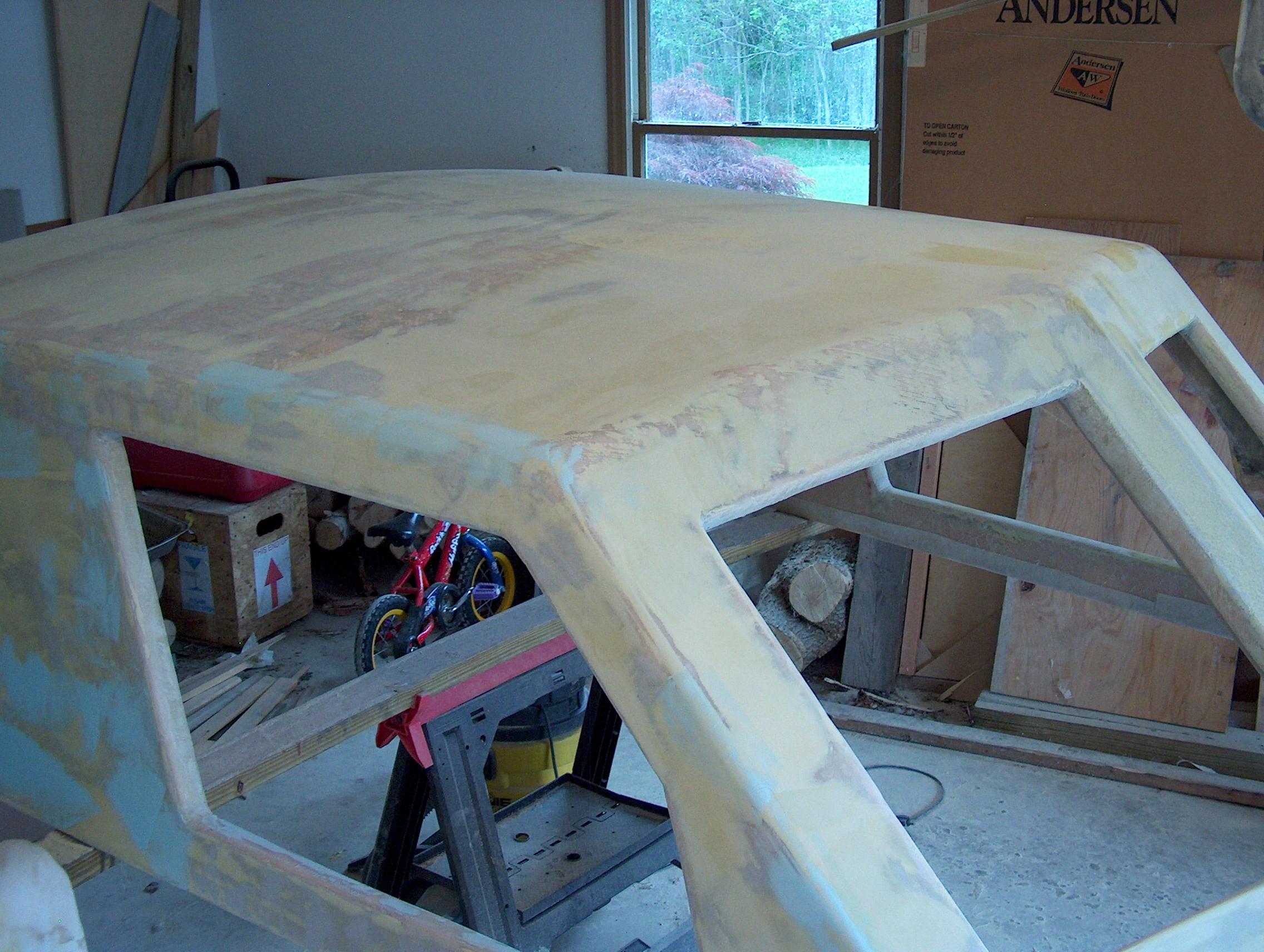 The Starboard side and the roof are coated in Marsons. This is what it looks like after the initial 80 grit sanding block.