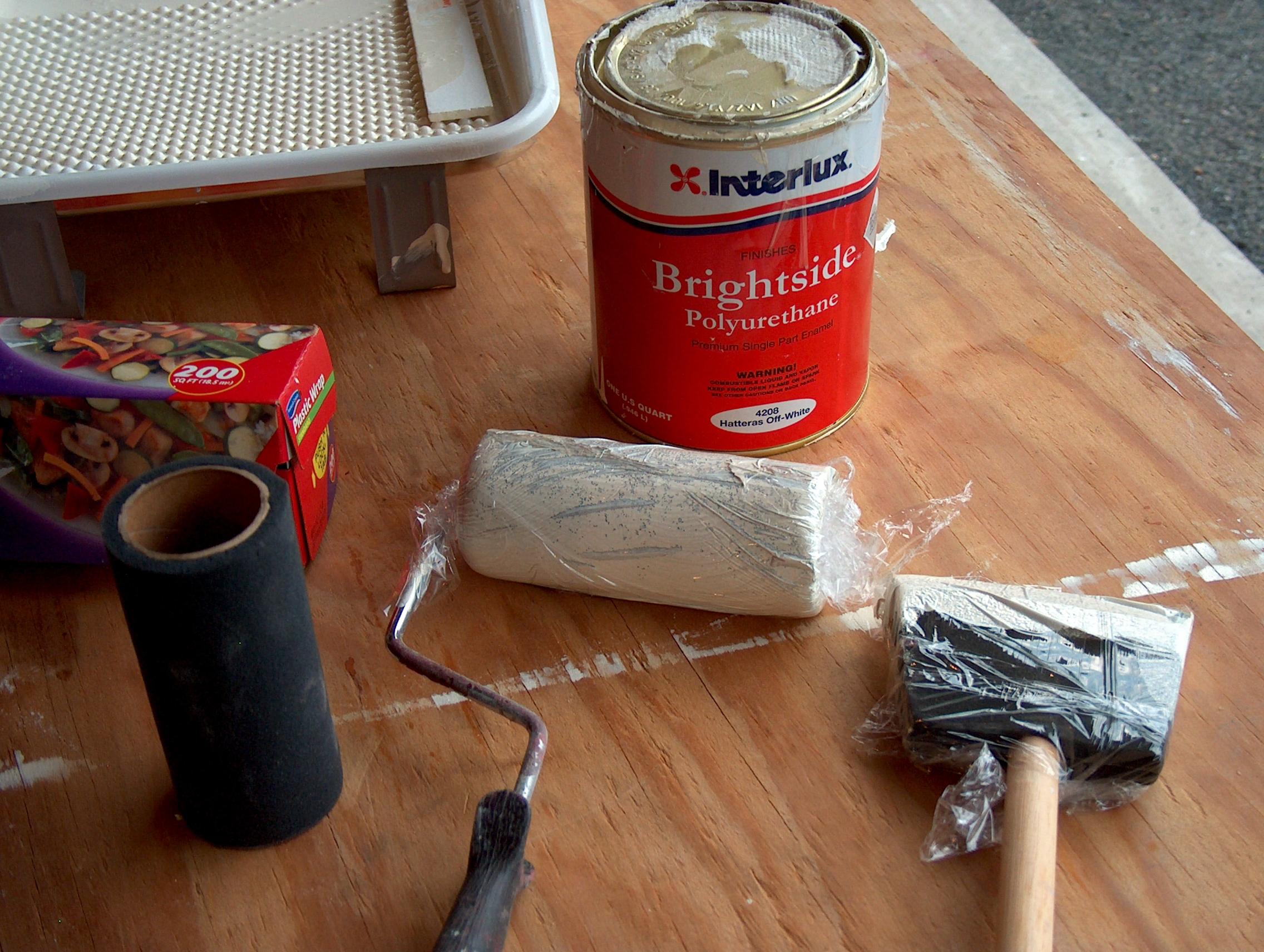 The paint, and foam roller and foam brush used to paint.