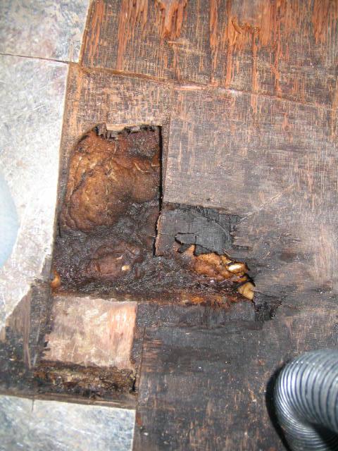 I cut out a portion of the fiberglass floor and pulled up a piece of the floor to see what was under it. It looks like the foam is water logged.