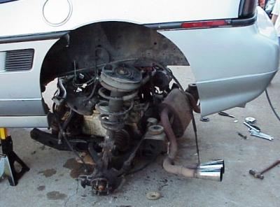 The entire powertrained is lowered onto a dolly. Care must be taken to ensure everything is disconnected and out of the way when lowering this. If everything is out of the way, it will lower very easy. The suspension a-arms and exhaust do not need to be removed to perform this.