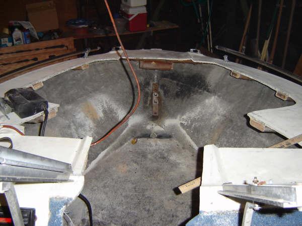 I took out some more of the bow today. I have started to cut large pieces of cardboard where im going to wrap plywood around the bow under whats left of the top. Im going to glass that to the underside of the top and to the inside of the hull all the way around.