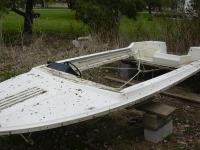 Here you can see the 4-point harness I made up to lift the deck off using a come-along. Looks kinda like a Flinstone boat...