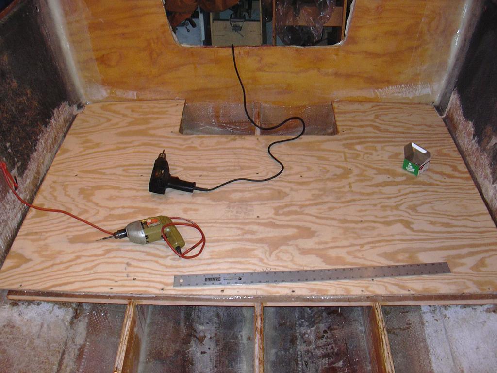 May 2007 - Sporatic work over the winter, limited by some house projects getting into my boat budget. Anyway, here is the new floor going in. Using 1/2 inch exterior plywood, sealed with epoxy all the way around. Held down with stainless screws.