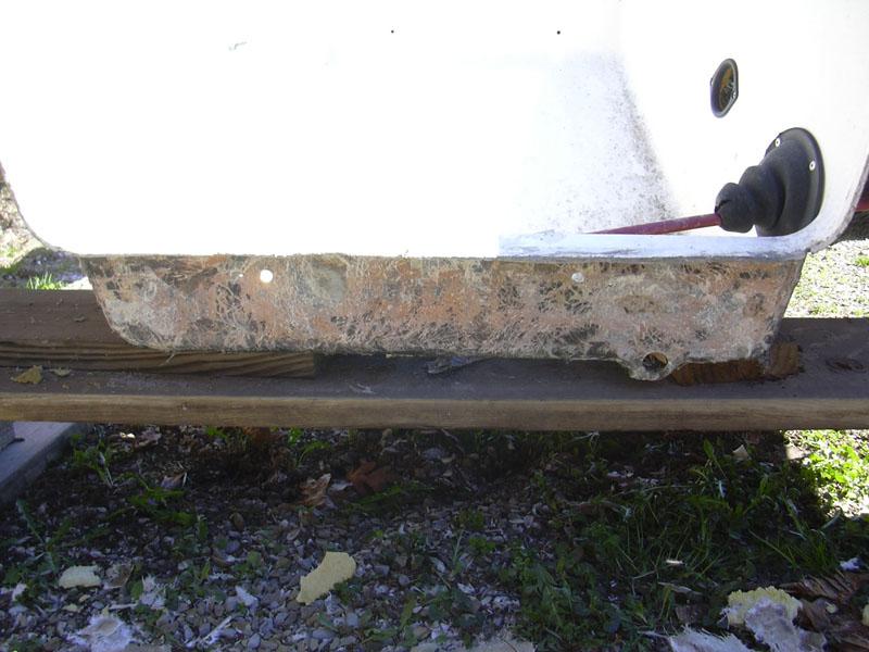 Cleaning up the inside skin of the transom well - it had bits of rotted transom core stuck to it, plus lots of jagged fiberglass chunks.