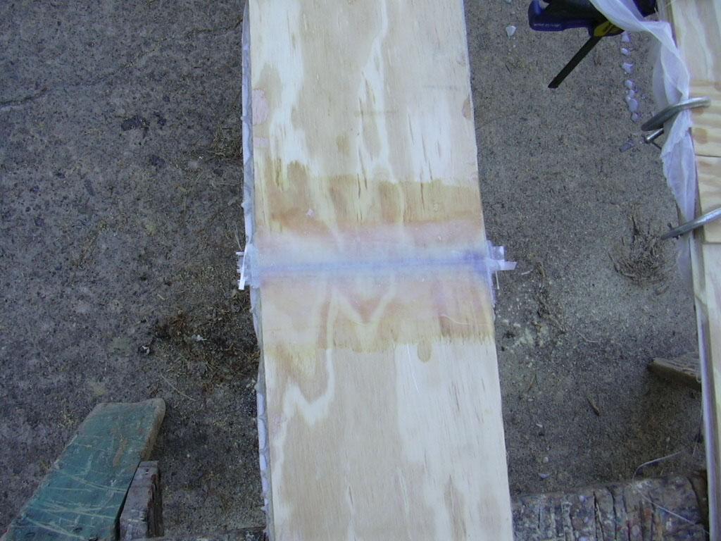 I made my stringers and keel out of 1/2-inch plywood sheets. Being that the keel measured in at about 14-feet long and plywood generally comes in 8-ft. sheets, I laminated up my own to length. I butt jointed the plys and staggered them at 4-ft. intervals. I also dished the butt a bit with a belt sander, then reinforced the joint with alternating layers of matt and cloth. VERY strong!