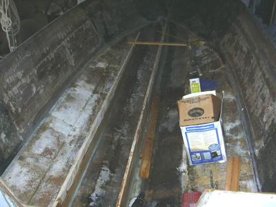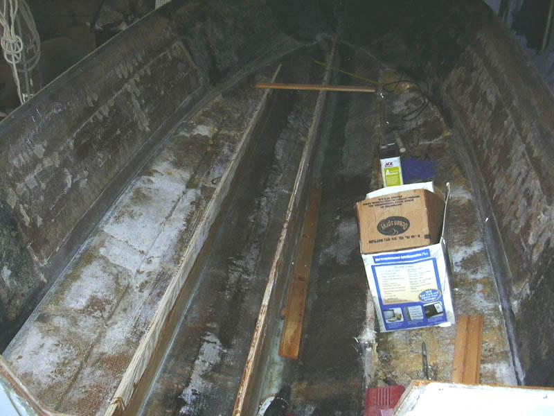 Getting the new stringers seated and fitted. I left a lip from the original glass in place to act as a guide and then glassed over everything with several layers of matt and cloth. Boat is VERY rigid now!