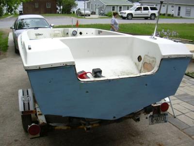 I patched the hole in the side of the motor well where the previous owners had cut out for the Chrysler's steering cable. The 1980 Johnson 75hp I will be putting on it will not need such a big hole.
