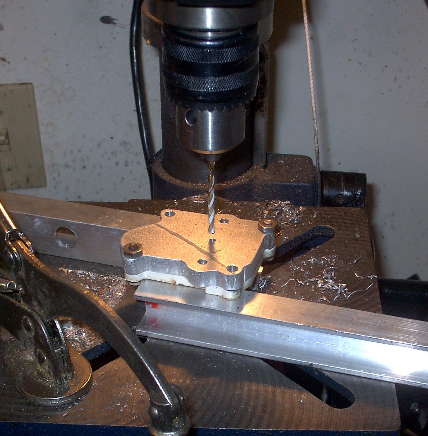 Temporarily bolt the mounting plate to the bypass cover, and use the hole you just drilled in the mounting plate to guide the drill in through the bypass cover. The 10hp cover is curved so this is virtually the only way to start the drill properly.