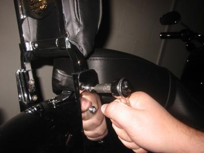 Remove that sissy bar from the bracket (T27 torx I think). Take the front bolt out of one side, swing the bracket up and put that front bolt right back in (after applying Loc-tite). Remove the rear bolt and then the bracket is free! But get that bolt back in there right away. Repeat on the other side.