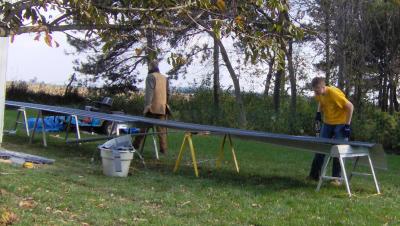 Well the panels I ordered were 18 foot 6 inches long and we needed 18 foot 2 so the boys got to cut 4 inches off of each panel. We rented a power sheers from the rental yard, so no snips needed, yet.