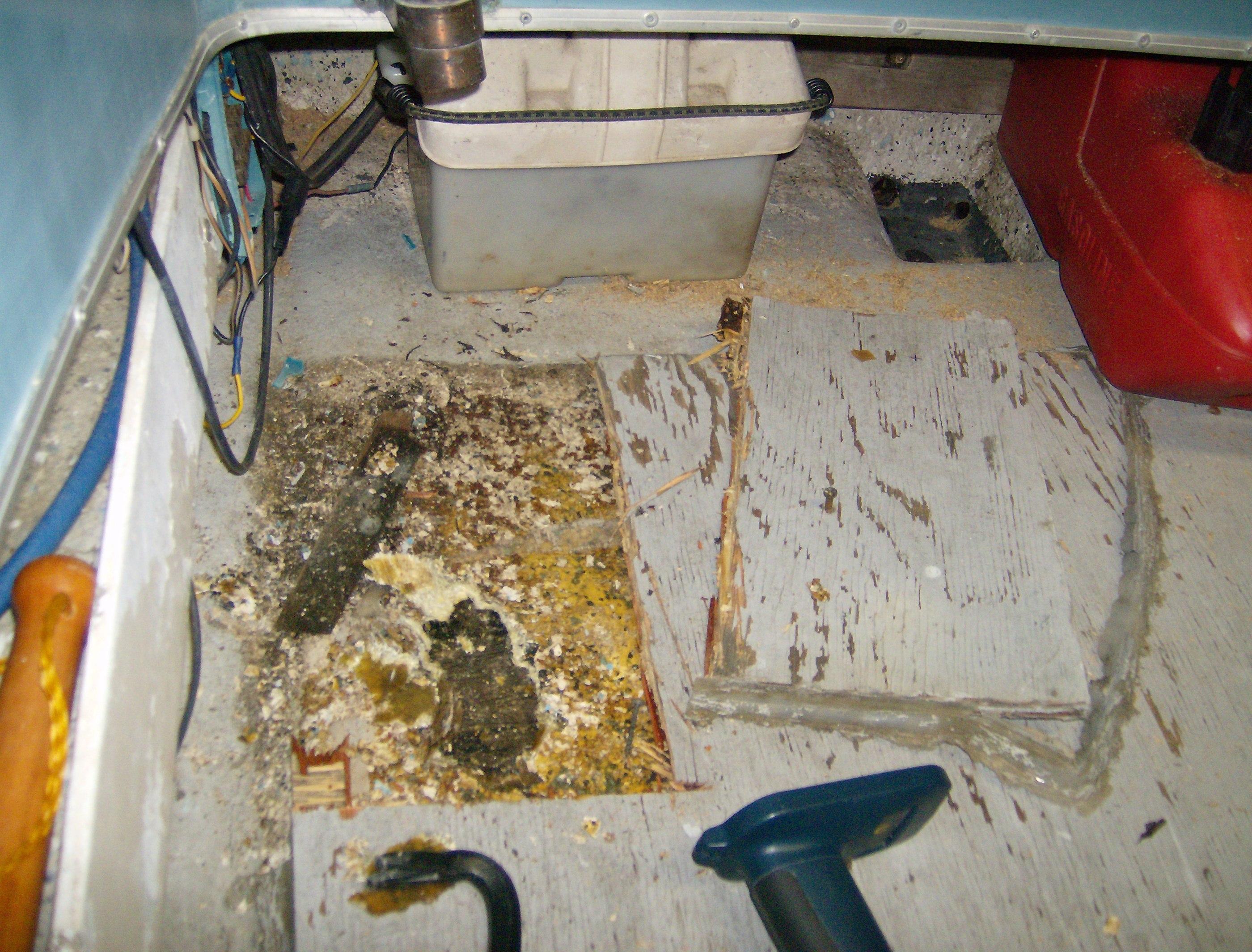 This is the start of my floor removal. You can see where the fiberglass is breaking away from the wood. I was able to use a mallet and break through this soft spot. I had to cut away the plywood the previous owner used to access the orginal floor.
