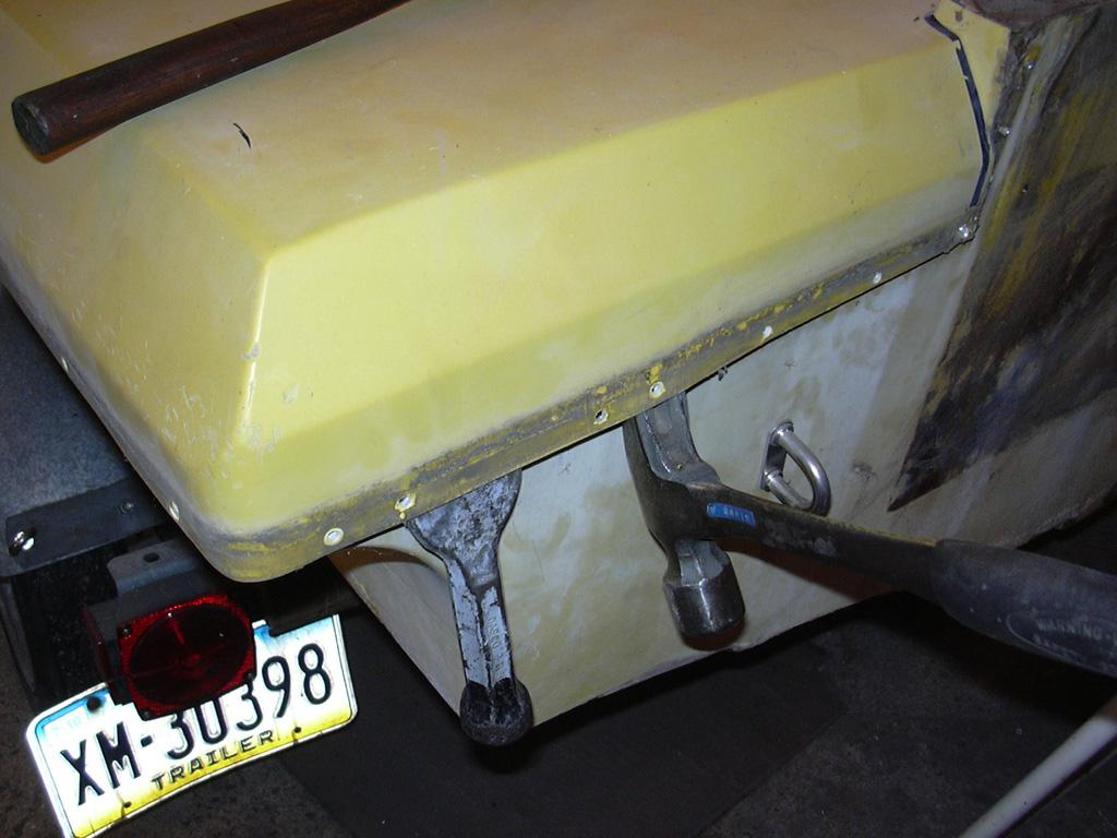 November 18, 2007: The easier way!! After calling it a day on Saturday, I pondered the issue a bit and came back ready to do battle on Sunday. Came up with a different plan - attacking the seam from the OUTSIDE. I discovered that if I drove a wide chisel up into the seam between the deck and hull sections I could tear the inner glass loose a bit. I worked my way around the boat three times, each time loosening it up a bit more until the inner glass tore completely away from the seam!