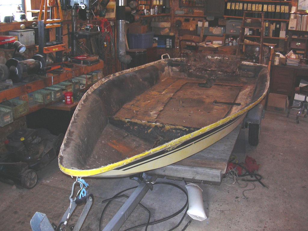 November 24, 2007: Found some help this morning and got the deck off! Also started cleaning up the loose fiberglass that was at the seam. Most of it peeled right off, with a little effort.