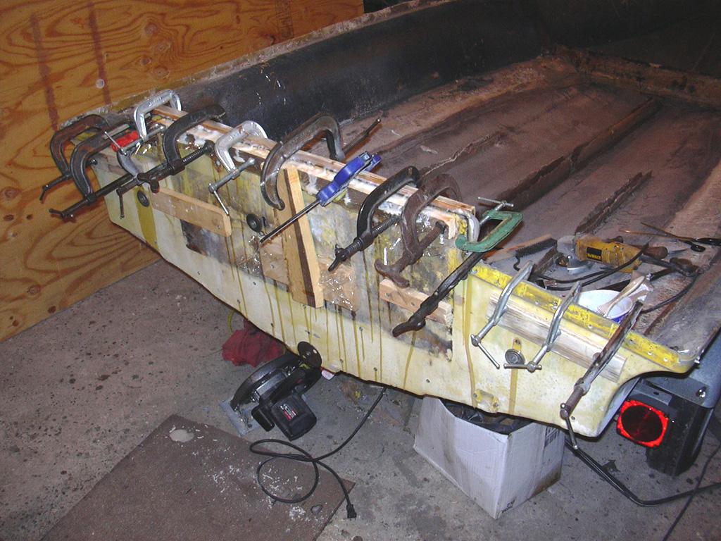 Lots of clamps to hold it all in place, but not TOO tightly, as I don't want to squeeze all the epoxy out. I also used some drywall screws with wide flat washers spaced around the lower portion to help pull it all together without dimpling the outer skin. The center board thing is a clamp extension to put some gentle pressure in the middle of the transom.