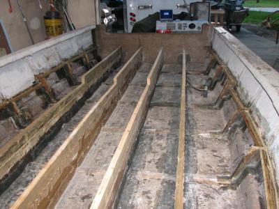 Here all of the stringers are in, the are spliced along their length since they didn't offer kiln dried lumber that was wide enough. I use PL polyurethane adhesive and 3" galvanized screws to attach them. I've also re-built the stiffeners on the sides from below the deck line and added supports where the deck joins the sides of the hull.