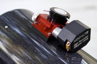 Close-up of the metal flaking on black near the red anodized Moonlite focuser.