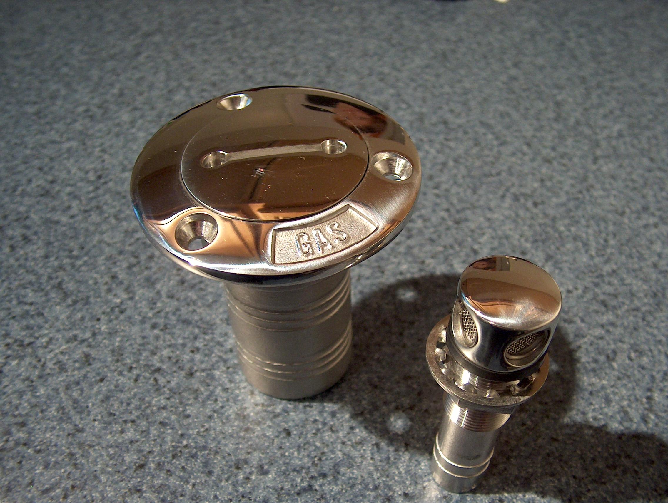 Sea Dog makes this really nice cast 316 stainless steel fill plate. With a screw on fill cap and O-ring seal, its water tight and will keep looking good for years. Used this same one on my MFG so I know it works really well. Coast Guard regulations specify that the fill cannot be located where an over-fill will let gas run inside the boat. So it will get mounted on the back side of the transom for ease of fill and to meet CG regs. The vent is also cast 316 stainless steel. Both of these parts will look like new for years in the salt water environment. Chrome plated zinc equivalent parts will last two years tops.