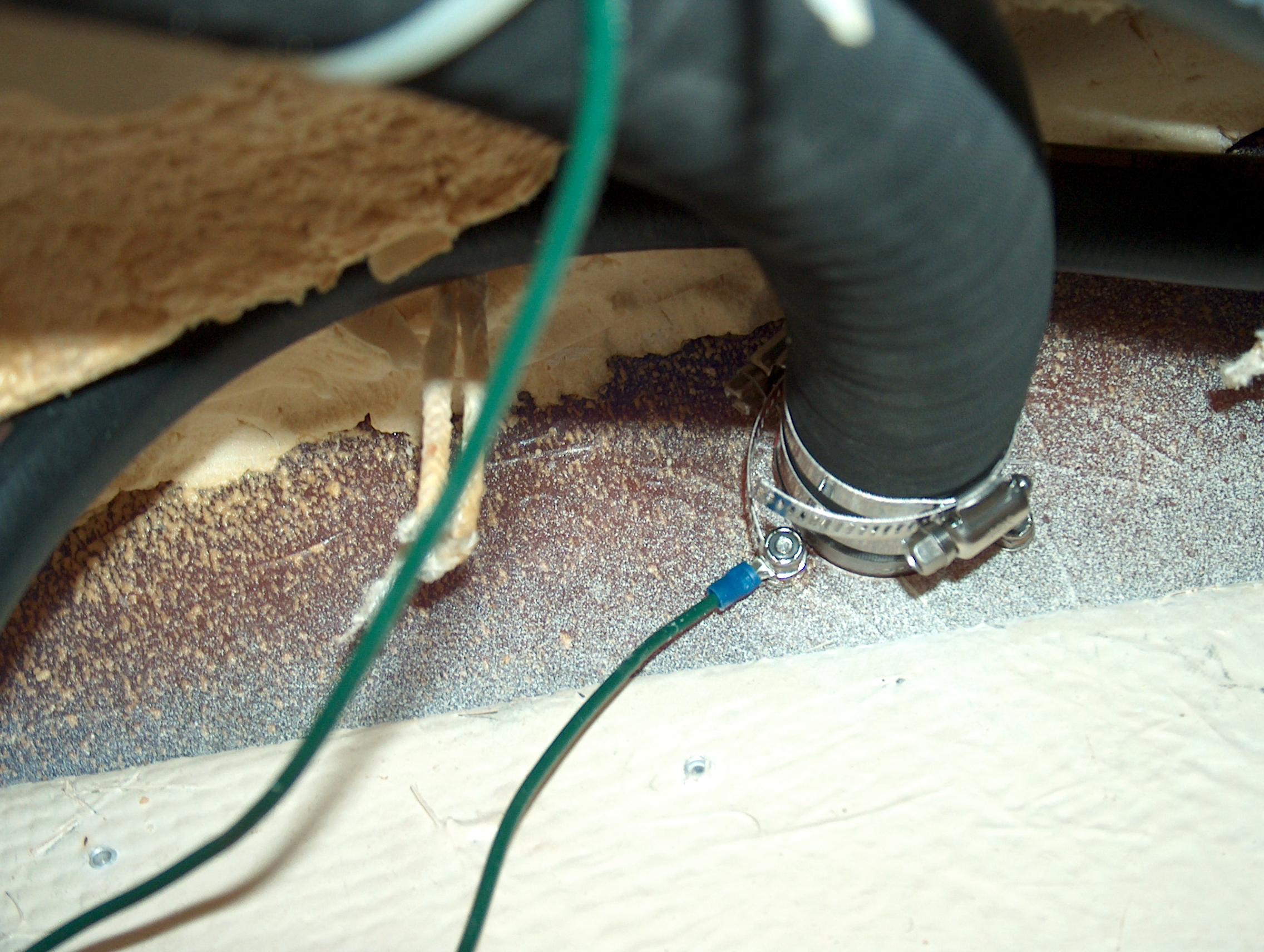 Fill hose connection to fuel fill from inside transom. Fuel fill is attached with screws and locking nuts with washers, sealed with Boatlife sealer. Very solid and rigid. Notice double stainless clamps, and green bonding wire as required by Coast Guard regulations. Also note that the fuel vent line loops above the fill before returning down to the tank.