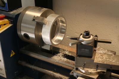 I purchased several lengths of aluminum piping in various inner and outer diameters. Each section was bored out and turned down on a Cummins 7x12 lathe. Here the focuser adapter is being bored out to match the GSO focuser's outer diameter.