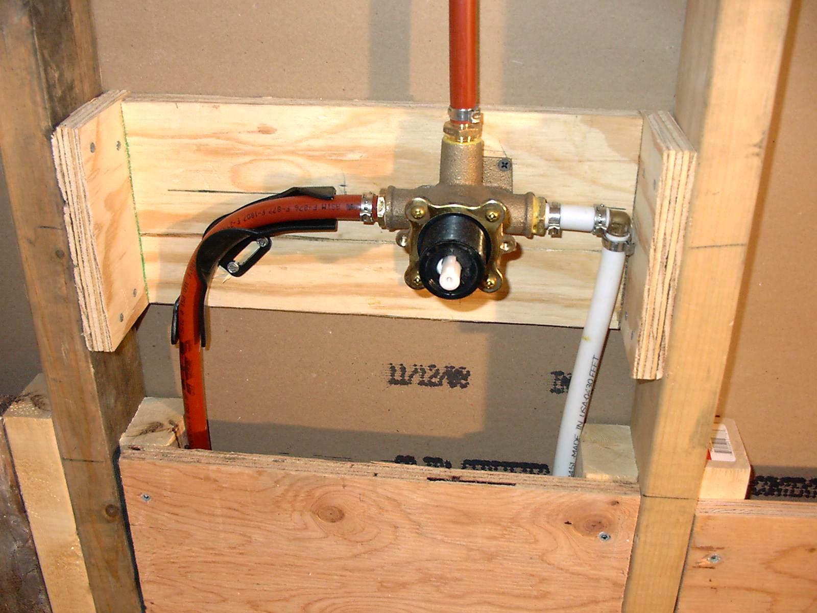 Of course when using copper to plumb this up, people usually use the pipe to hold and mount the valve. Well with PEX you cant do that. So that's why there is 3/4 plywood around the sides and back of the valve and the dropear for the shower head. That was about the easiest way I could come up with to mount the valve the right depth for the 1/2 drywall and tile.