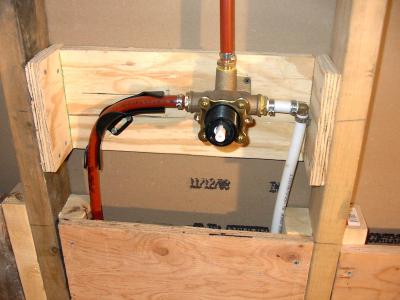 Ok, let talk plumbing for a minute. This is a typical pressure balancing shower valve installed with PEX plumbing. My Dad got me started on this stuff and it is AMAZING.. I installed 250 feet of 1/2 pipe, 5 separate runs in less than 1/2 hour. There are NO joints in that red hot water line from here all of the way back to the manifold at the hot water heater.