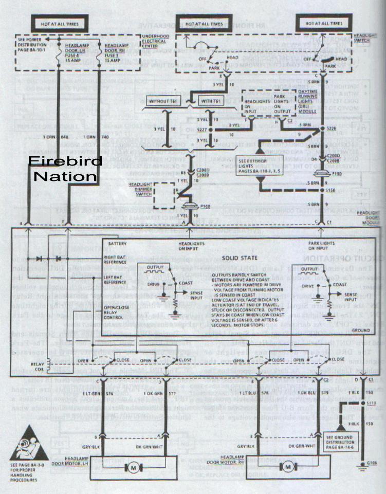 Found this wire diagram of the Headlight Door Control Module (DCM) on FirebirdNation.com. This was invaluable in helping me understand how the headlight doors worked. A lot different than I would have guessed.