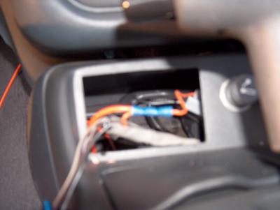This project needs an "always on" power feed. The Cigarette Lighter feed is always on and easy to tap into. The accessory panel in front of the shift is removed to access the wires. The thin orange wire is the factory feed to the cigarette lighter. It was cut and the new feed (thicker orange wire from switch) was crimped on.