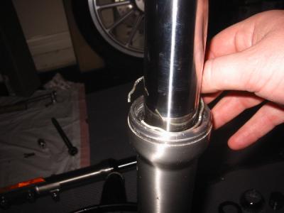 Here is a better shot showing the retaining clip. I was able to remove this clip just by using a screwdriver. The clip fits into a groove inside the slider that keeps the seal in place.