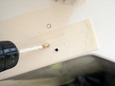 Measured, apply masking tape, marked and drilled holes for the hardware. Note tape on drill bit as depth gauge.