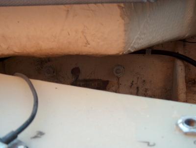 Just behind the fuel tank are the lower mounting bolts for the Force outboard. To remove those bolts, the gas tank must come out.