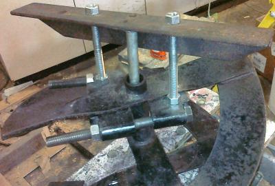 You can't pull on the outer rim of the auger, you need to grab it close to the center, etc. SO what finally materialized was a large bearing separator clamped around the auger at the end, with 2 - ½ inch bolts connected to a ¼ x 2 inch angle iron as an improvised gear puller. (this photo was taken when I had already gotten the auger part way off..)
