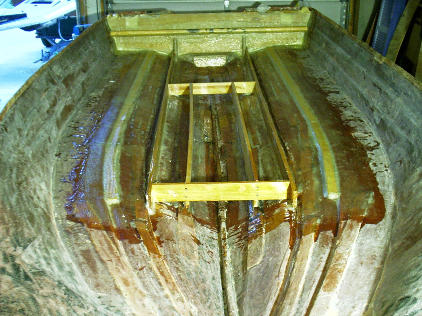 Here's the stringers, glassed in with 18oz woven roving and epoxy.