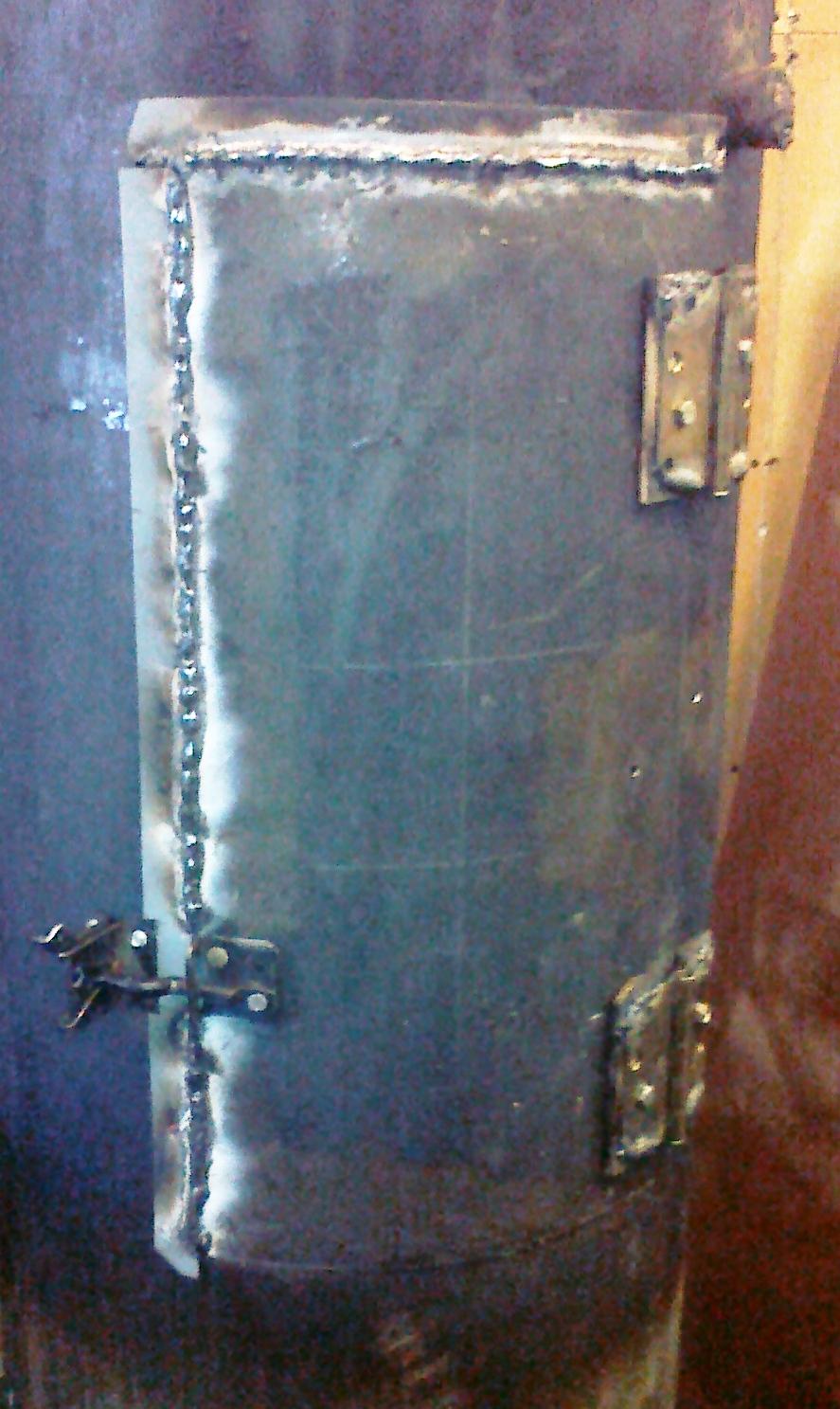 Dug up some more 1/8 inch strap iron in the shop and welded it to the door.. Of course I'm not the welding guru so I had to take the door off and lay it down to weld that top strap on ..