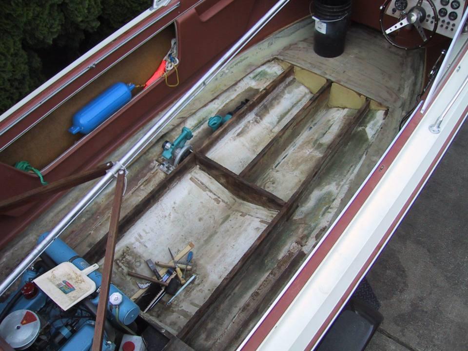 I have left about four inches of the original flooring so that I will not have to recreate the hull bond with the new floor. Fortunately there was no rot that close to the hull.